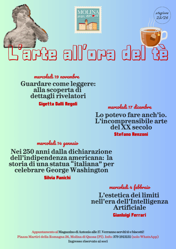“L’arte all’ora del tè” inizierà mercoledì 19 novembre con Gigetta Dalli Regoli e andrà avanti il 17 dicembre con Stefano Renzoni, il 14 gennaio con Silvia Panichi e terminerà con Gianluigi Ferrari il 4 febbraio. In occasione di ogni appuntamento, alle 17, saranno serviti tè e biscotti.