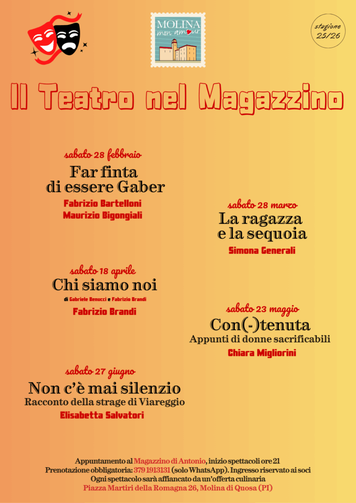 Il Teatro nel Magazzino esordirà sabato 28 febbraio con “Far finta di essere Gaber” di Fabrizio Bartelloni e Maurizio Bigongiali, poi gli appuntamenti proseguono sabato 28 marzo con “La ragazza e la sequoia” di Simona Generali, il 18 aprile con “Chi siamo noi” di Gabriele Benucci e Fabrizio Brandi interpretato da quest’ultimo, il 23 maggio con “Con(-)tenuta. Appunti di donne sacrificabili” di e con Chiara Migliorini e per finire sabato 27 giugno con Elisabetta Salvatori, che proporrà il suo “Non c’è mai silenzio” dedicato alla strage di Viareggio. L’ingresso a tutti gli eventi è riservato ai soci di Molina mon amour.